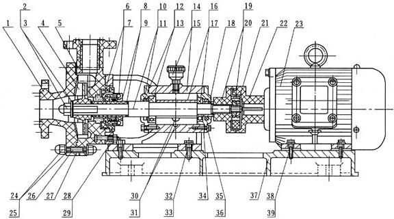 6、如果更換滾珠軸承或泵軸時,必須折下機架,松開前端軸承蓋4只螺釘,折下泵軸后端園螺母和聯(lián)軸節(jié),將泵軸向前端方向打出即可,再后折下后端軸封蓋。